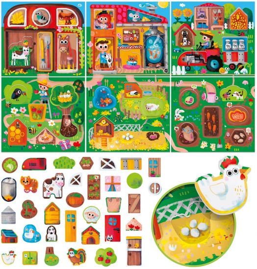 Комплектът включва 6 карти с различни зони на фермата и 36 картонени фигури, изработени от здрав и качествен картон. Фигурите се поставят на правилните места върху картите, което превръща ученето в забавно и естествено преживяване чрез експериментиране и самостоятелна игра.