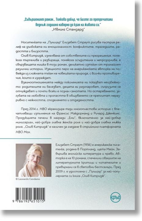 Олив Китридж, измъчвана от собствените си прегрешения, понякога търпелива и разбираща, понякога осъдителна и непрозорлива, е свързващата нишка в този роман, деликатно изтъкан от тринайсет различни истории. Изящното перо на американската авторка ни повежда из сложната тъкан на човешката природа, с всички противоречия, които я изграждат.
