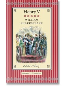 Корица на книгата "Хенри V" (Collector's Library) от Уилям Шекспир, представяща кралска средновековна сцена, илюстрирана от сър Джон Гилбърт, на фона на червени и бели вертикални ивици с декоративни рамки.