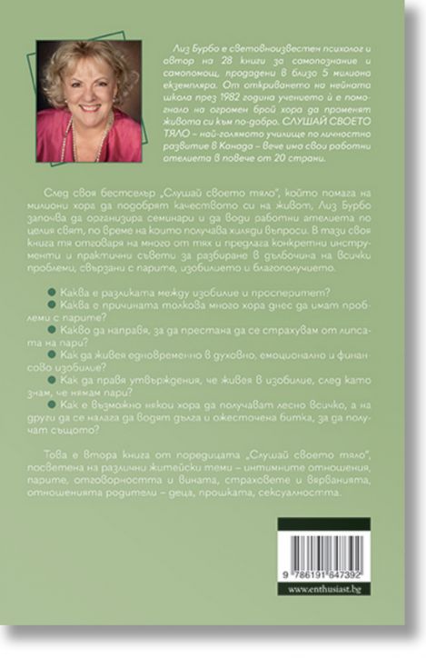 Това е втора книга от поредицата „Слушай своето тяло“, посветена на различни житейски теми – интимните отношения, парите, отговорността и вината, страховете и вярванията, отношенията родители – деца, прошката, сексуалността.