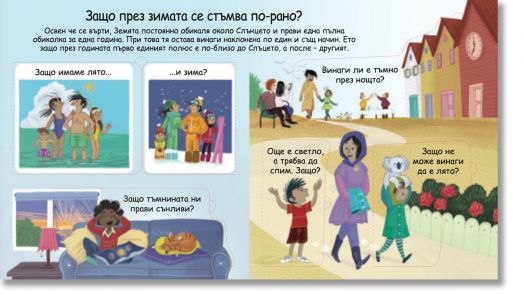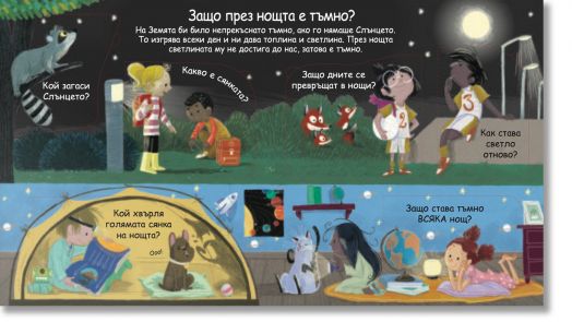 „Първи въпроси и отговори: Защо през нощта е тъмно?“ въвежда малките читатели в темата за деня и нощта чрез интересни обяснения и интерактивни елементи.