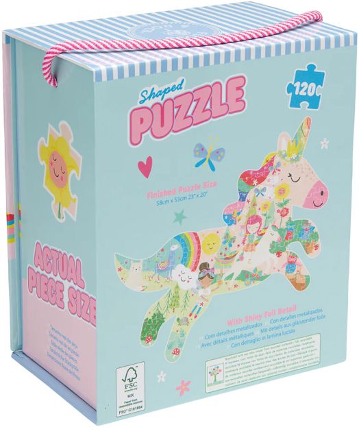 Забавен и цветен пъзел от 120 части в нестандартна форма, с красиви фолирани детайли.