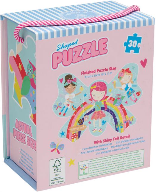Забавен и цветен пъзел от 30 части в нестандартна форма, с красиви фолирани детайли. Комплектът е опакован в здрава кутия с магнитно закопчаване и удобна дръжка за носене — идеален за игра у дома и в движение.