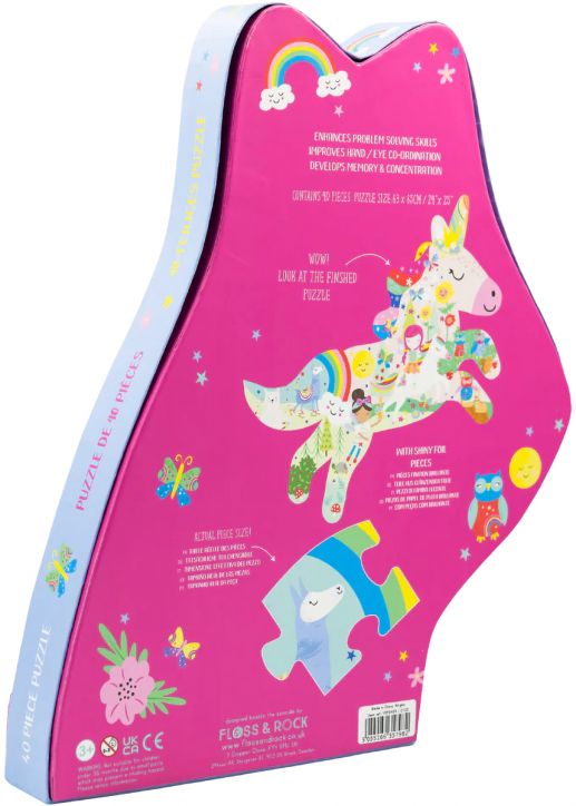 Пъзелът е опакован в красива, многократна кутия с форма на еднорог и блестяща грива. Вътре ще откриете 40 големи, стабилни части с блестящи фолирани детайли, създадени специално за малки детски ръчички. Играта с пъзела подпомага развитието на логическото мислене, концентрацията, паметта и координацията око-ръка.