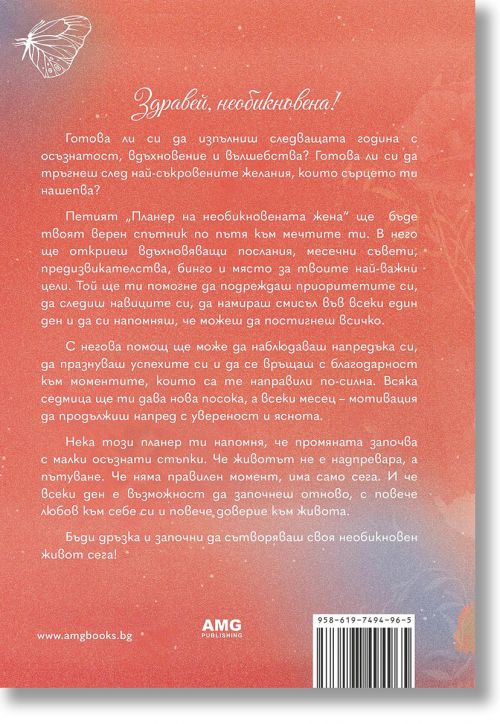 „Планер на необикновената жена“ ще бъде твоят верен спътник по пътя към мечтите ти. В него ще откриеш вдъхновяващи послания, месечни съвети, предизвикателства, бинго и място за твоите най-важни цели. Той ще ти помогне да подреждаш приоритетите си, да следиш навиците си, да намираш смисъл във всеки един ден и да си напомняш, че можеш да постигнеш всичко.