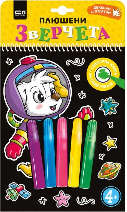 „Плюшени зверчета“ е сензорна книга за оцветяване с включени флумастери, която едновременно развива фината моторика и стимулира сетивното възприятие.