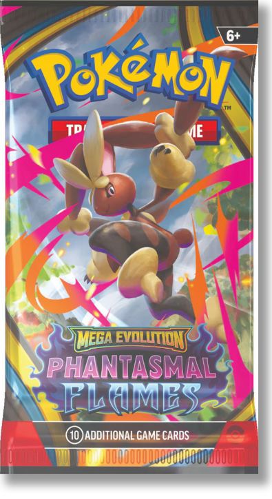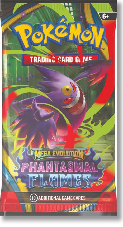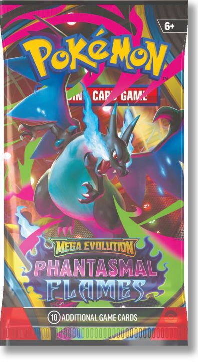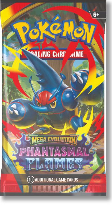 Буустър пакетът Pokemon TCG: Mega Evolution Phantasmal Flames Booster включва 10 карти* и 1 Basic Energy от поредицата Mega Evolution Phantasmal Flames. Цялата поредица съдържа над 120 карти.