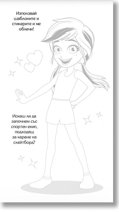 12 листа с невероятни десени, 2 листа с цветни стикери и 1 лист с шаблони, с чиято помощ рисуването на облекла е детска игра!