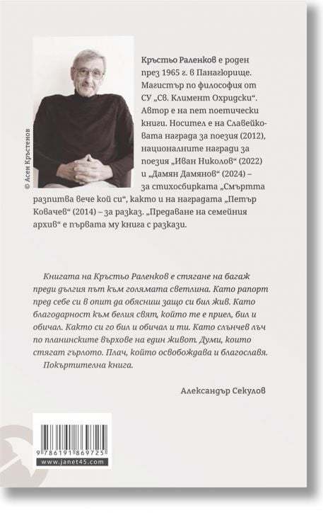 Книгата на Кръстьо Раленков е стягане на багаж преди дългия път към голямата светлина. Като рапорт пред себе си в опит да обясниш защо си бил жив. Като благодарност към белия свят, който те е приел, бил и обичал. Както си го бил и обичал и ти. Като слънчев лъч по планинските върхове на един живот. Думи, които стягат гърлото. Плач, който освобождава и благославя.