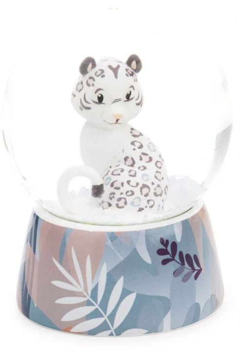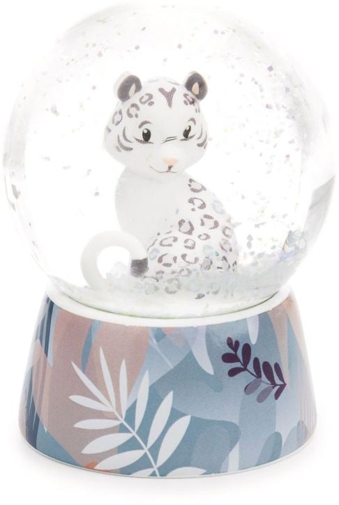 Красив снежен леопард във възторг от пухкавите снежинки, които се вихрят във въздуха, когато блестящият глобус се движи.