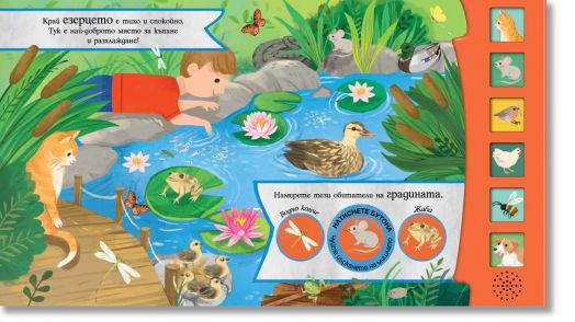Разходете се из страниците на тази книга и чуйте чудните звуци на оживената градина. В нея ще се запознаете и сприятелите с много животни!
