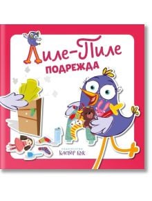 На корицата на "Лиле-Пиле подрежда" е изобразена весела Лиле-Пиле, карикатурна птица с играчки и дрехи, до кутия, която предлага забавление за сортиране. Заглавието е изписано на кирилица на розов и бял фон.