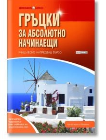 На корицата на "Гръцки за абсолютно начинаещи - второ издание" са изобразени бяла сграда със сини акценти, вятърна мелница и море под ясно небе. Удебеленото заглавие се появява в бяло и жълто на червено-оранжев фон.