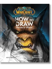 Корица на книгата за World of Warcraft: Как да рисуваме герои и злодеи, с подробна илюстрация на художника на Blizzard на свирепо, подобно на вълк същество с жълти очи и остри зъби, както и класическото лого на World of Warcraft в горната част.