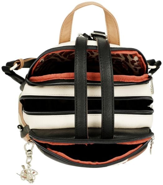 Тази дамска раница със среден размер съчетава стил и практичност. Моделът разполага с три отделни отделения, подплатена вътрешност с джобове за по-добра организация и допълнителен джоб на гърба.