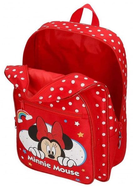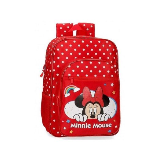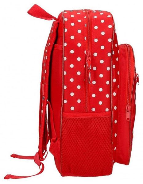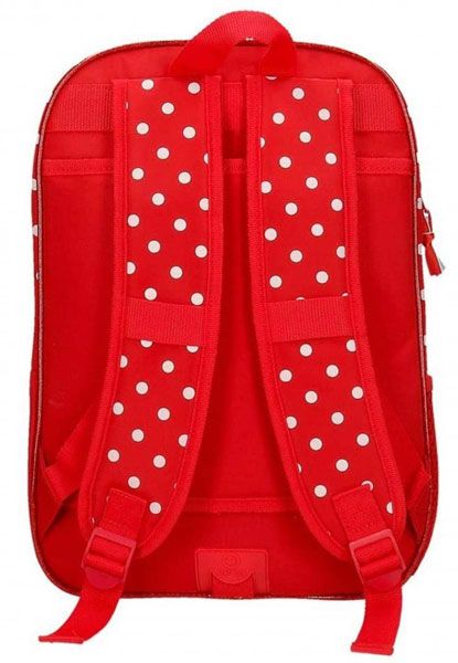 Ученическа раница Pepe Jeans Minnie Rainbow Red в наситеночервен десен на бели точки.
