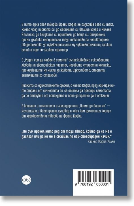 В нито една своя творба Франц Кафка не разкрива себе си така, както чрез писмата си: до любимите си Фелице Бауер и Милена Йесенска, до близките си приятели, до баща си. Откровени, прями, дълбоко емоционални, тези текстове са неповторимо свидетелство за изключителната му чувствителност, сложен гений и още по-сложен характер.