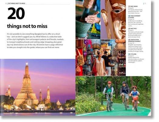 - Must-see pick – unmissable sights handpicked by our authors - Wat Arun, Thai cookery classes, Wat Pho, Chatuchak, weekend market, cycling, Jim Thompson’s House, Songkhran, Thanon Khao San, traditional massage, Muang Boran Ancient City, National Museum, Ayutthaya, Vimanmek Palace, Erawan Shrine