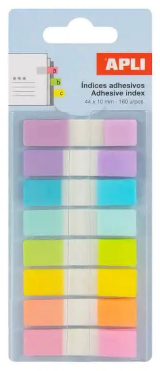 Комплект от 160 разноцветни самозалепващи индекси / листчета Apli Happy Idex Pastel Doble A, B, C в пастелни тонове е едно практично и декоративно решение за организиране и класифициране на документи, книги и файлове.