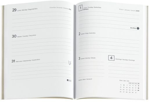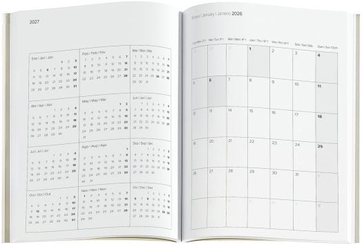 Страници за лична информация, 3-годишен календар, месечен планер, допълнителни листа за бележки и адреси / телефони.