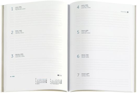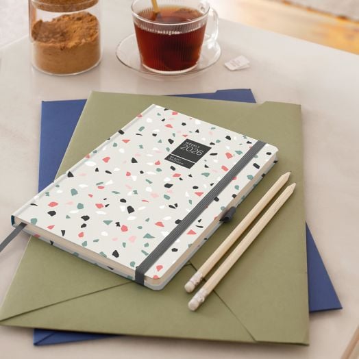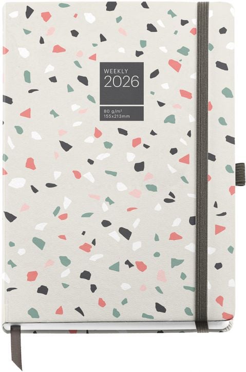 Класически бележник - органайзер Miquelrius Grafica Terrazo Plus за 2026 година с твърди корици и годишно планиране — една седмица на две страници.