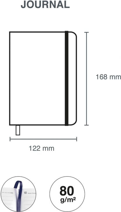 Вътрешен джоб за бележки, еластична примка за пишещи средства, страници за лична информация, 2-годишен календар, допълнителни листа за бележки и адреси / телефони.