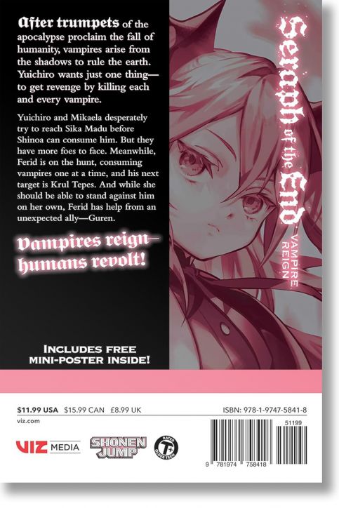 Yuichiro and Mikaela desperately try to reach Sika Madu before Shinoa can consume him. But they have more foes to face. Meanwhile, Ferid is on the hunt, consuming vampires one at a time, and his next target is Krul Tepes. And while she should be able to stand against him on her own, Ferid has help from an unexpected ally—Guren.