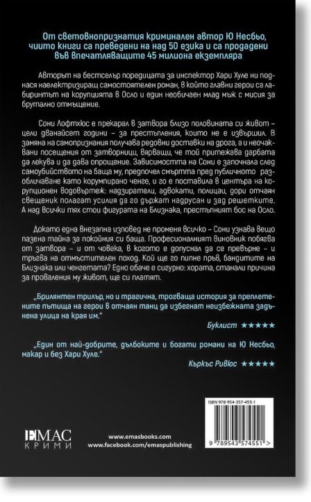 Авторът на бестселър поредицата за инспектор Хари Хуле ни поднася наелектризиращ самостоятелен роман, в който главни герои са лабиринтът на корупцията в Осло и един необичаен млад мъж с мисия за брутално отмъщение.