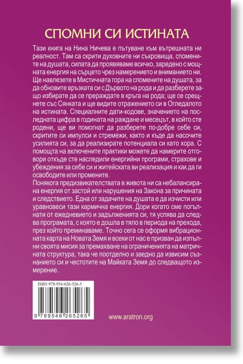 Тази книга на Нина Ничева е пътуване към вътрешната ни реалност. Там са скрити духовните ни съкровища, спомените на душата, силата да проявяваме всичко, заредено с мощната енергия на сърцето чрез намерението и вниманието ни. Ще навлезете в Мистичната гора на спомените на душата, за да обновите връзката си с Дървото на рода и да разберете защо избирате да се прераждате в кръга на рода; ще се срещнете със Сянката и ще видите отражението си в Огледалото на истината. Специалните дати-кодове, значението на последната цифра в годината на раждане и месецът, в който сте родени, ще ви помогнат да разберете по-добре себе си, скритите си импулси и стремежи, както и къде да насочите усилията си, за да реализирате потенциала си като хора. С помощта на включените практики можете да намерите отговори откъде сте наследили енергийни програми, страхове и убеждения за себе си и житейската ви реализация и как да ги освободите или промените.