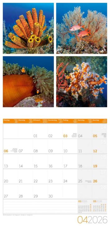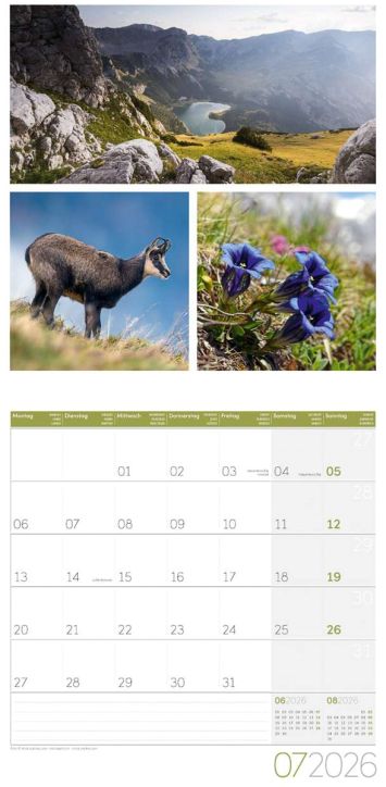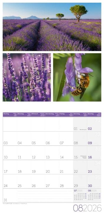 Съдържа календариум за настоящ месец на 4 езика - немски, английски, френски и италиански.