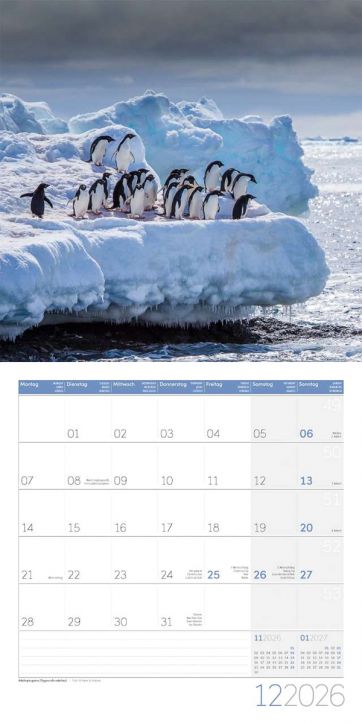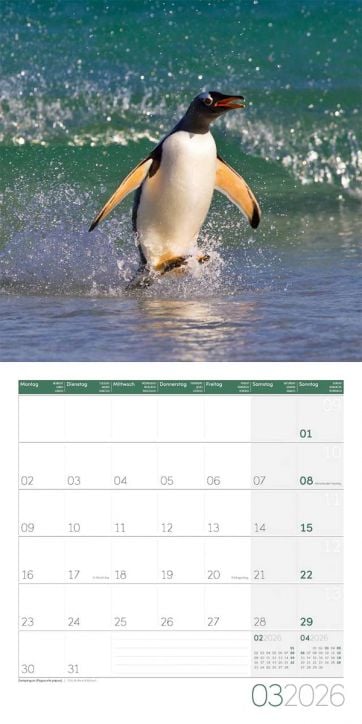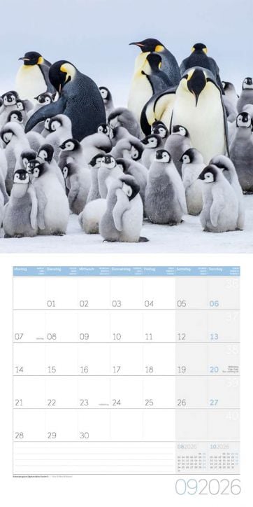 Вертикален стенен календар Ackermann за 2026 година с 12 впечатляващи изображения на тема: Penguins - Пингвини.