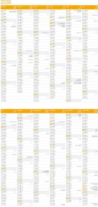 Съдържа календариум за настоящ месец на 4 езика - немски, английски, френски и италиански.