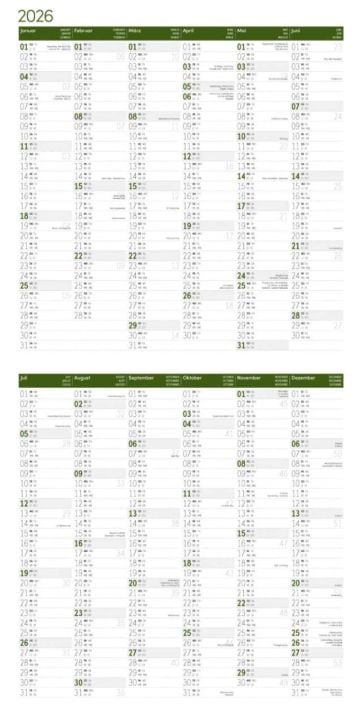 Съдържа календариум за настоящ месец на 4 езика - немски, английски, френски и италиански.