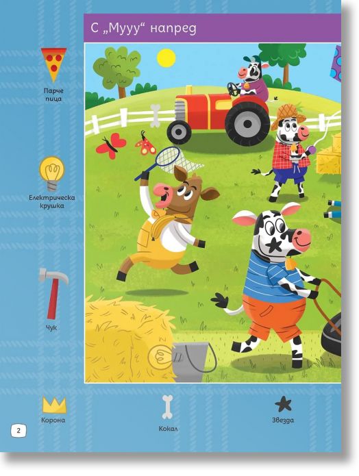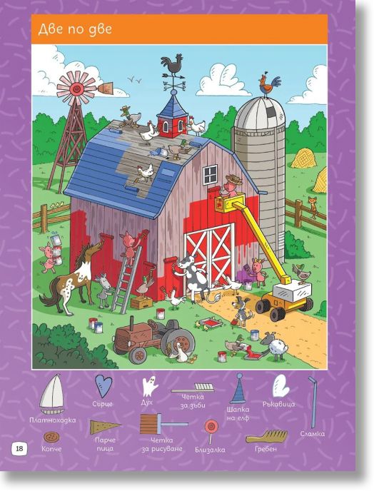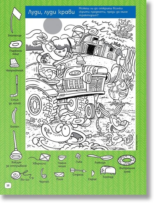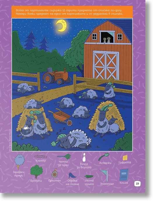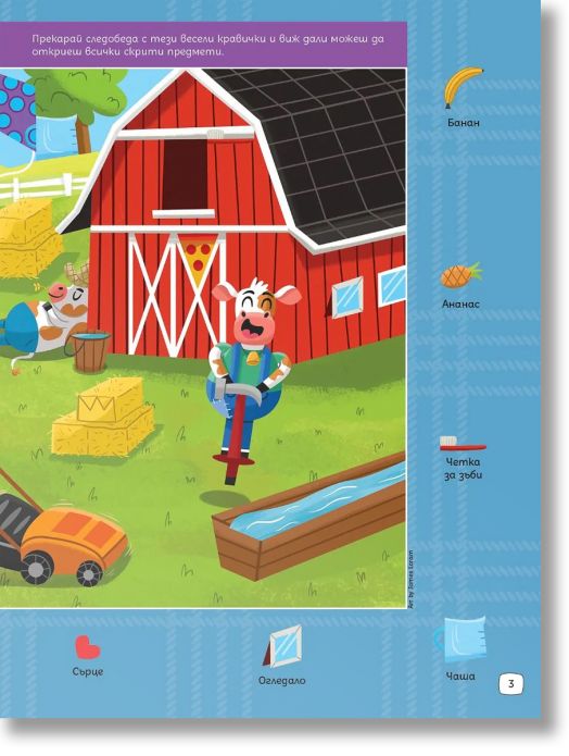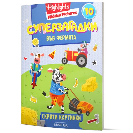 Готови ли сте за истинско фермерско приключение? В тази забавна и пъстра книжка децата ще се впуснат в търсене на над 300 скрити предмета, умело прикрити сред весели и детайлни илюстрации от живота във фермата.