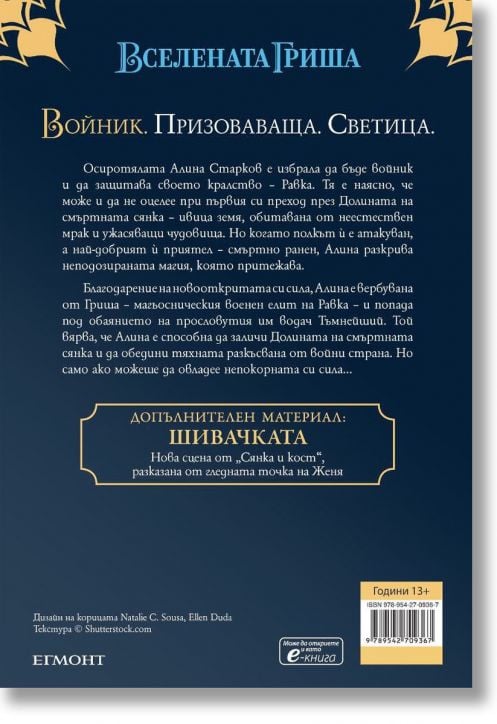 Но този великолепен свят не е това, което Алина е очаквала. Мракът напредва, страната разчита на неосъзнатите ѝ сили, а тя ще трябва да се изправи пред тайните на Гриша... и пред тайните на сърцето си.