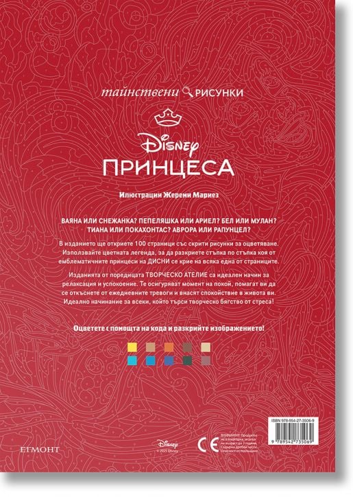 В изданието „Тайнствени рисунки: Принцеси” ще откриете 100 страници със скрити рисунки за оцветяване. Използвайте цветната легенда, за да разкриете стъпка по стъпка коя от емблематичните принцеси на Дисни се крие на всяка една от страниците.