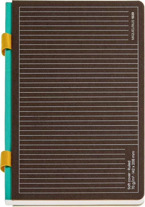 Твърди картонени корици в сиво-кафяв цвят и двойна еластична примка за пишещи средства в слънчевожълт цвят.