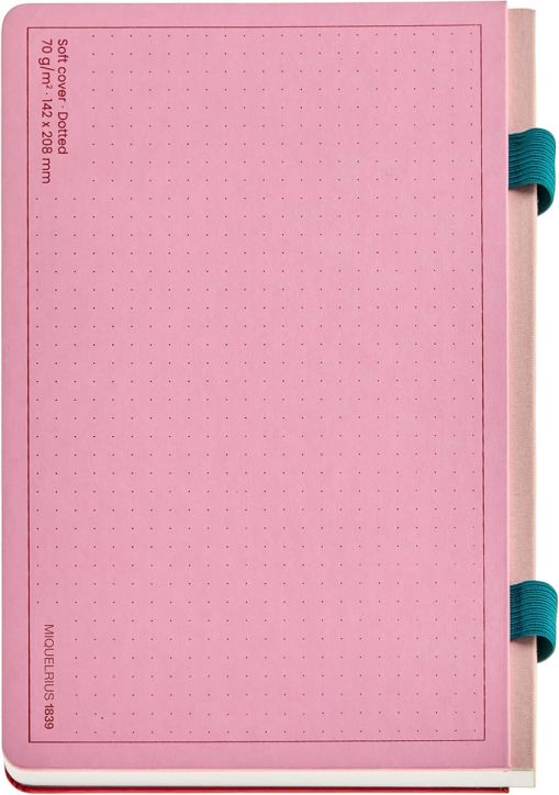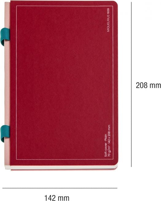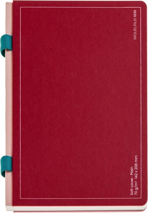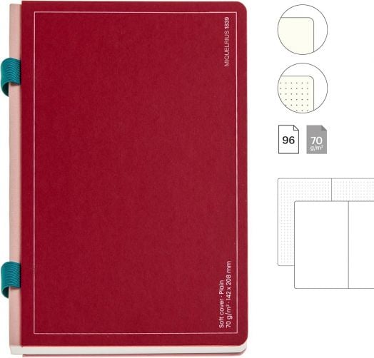Тефтер Miquelrius B2B Doble Rojo A5 с комбинирано съдържание - 86 нелинирани листа и 10 листа на точки, където точките са разположени в квадратна точкова мрежа с интервали 5 х 5 мм.