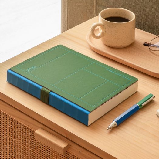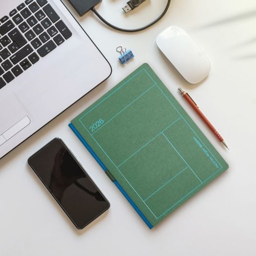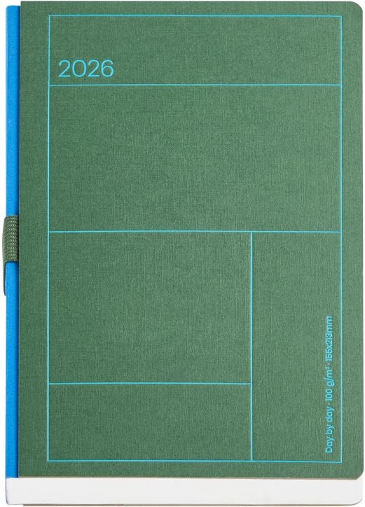 Класически бележник - органайзер Miquelrius Back To Basic Lineas Verde за 2026 година с полутвърди картонени корици и годишно планиране — един ден на страница (събота и неделя делят една страница).