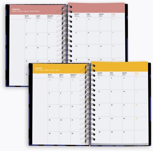 С месечен календар, разположен на две страници и предшестващ всеки месец - с предвидено достатъчно място за кратки бележки и организниране на дълъг период от ереме (един месец)