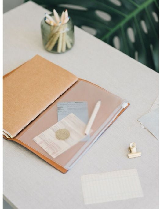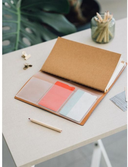 Този тефтер е едновременно дневник за пътуване и калъф на карти. Разполага с 3 слота за карти, както и джоб със закопчаване с цип, където можете да съхранявате телефона си, малки документи, химикалка, паспорта си или други малки аксесоари.