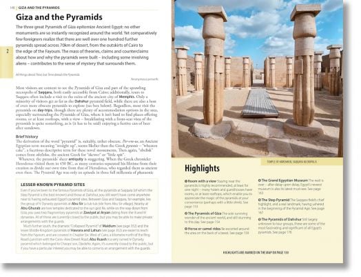 - Must-See pick – a curated selection of not-to-miss sights as chosen by our authors - Mount Sinai, Islamic Cairo, diving and snorkelling, Valley of the Kings, catacombs of Kom El Shoqafa, Alexandria, sailing on feluccas, Farafra Oasis, pyramids of Dahshur, balloon rides, the Egyptian Museum;