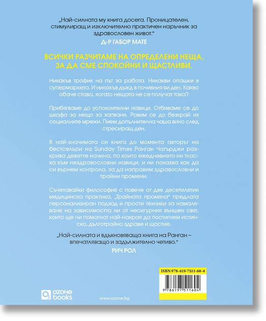 Съчетавайки философия с повече от две десетилетия медицинска практика, „Трайната промяна“ предлага персонализиран подход и прости техники за намаляване на зависимостта ни от несигурния външен свят, които ще ни помогнат най-накрая да постигнем истинско, дълготрайно здраве и щастие.
