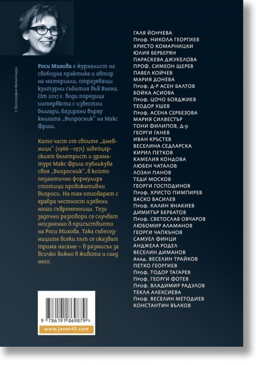 Като част от своите „Дневници“ (1966 –1971) швейцарският белетрист и драматург Макс Фриш публикува своя „Въпросник“, в който педантичнo формулира стотици провокативни въпроси. На тях отговарят с храбра честност изявени наши съвременници.