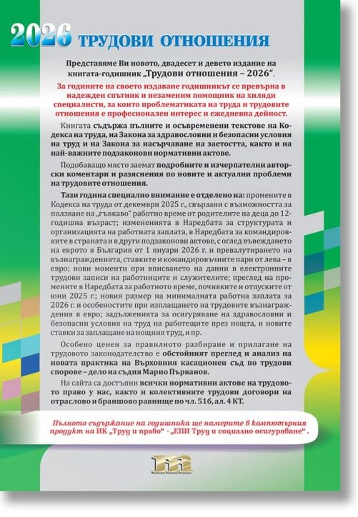 „Трудови отношения – 2026 година“ е утвърдено ежегодно издание за прилагането на трудовото законодателство в България.