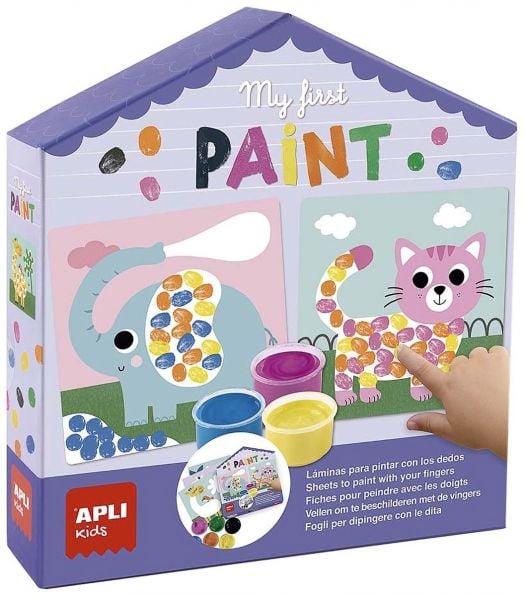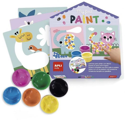 Творчески комплект Apli Kids „My First – Животни“ за рисуване с пръсти, който позволява на децата да рисуват с пръсти по специално обозначени участъци върху картонени шаблони с животинска тематика.