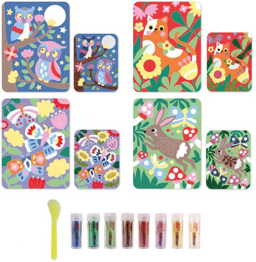 Как се играе: Децата премахват защитния слой от избраните зони върху илюстрираните карти и поръсват глитера в различни цветове – могат да следват примерите или да проявят собствена фантазия.