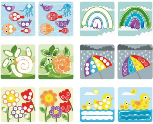 Комплектът съдържа 6 илюстрирани листа с различни теми, които се допълват чрез поставяне на цветни точки.