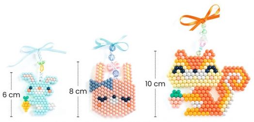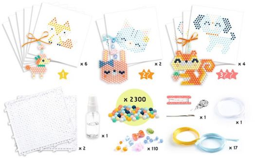 С този артистичен комплект децата могат да правят повече от 12 различни пухкави животински фигурки – от малки до големи модели – като използват над 2 300 цветни водни мъниста, които се залепват само с помощта на вода.