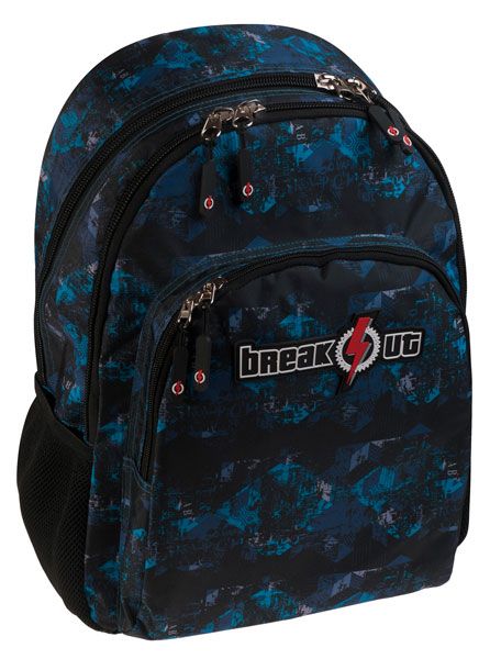 Ученическа раница от серията Break Out на Busquets с десен в модерен градски стил и с преобладаващи цветове синьо и черно.